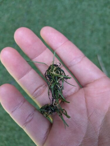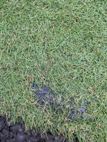 こうした強度が弱い芝は、通常利用でも抜けやすく、さらにワンチャンが抜けた部分が気になって、引っ掻いたり、噛んだりして、さらに抜けてくる、という悪循環に陥ってしまいます。