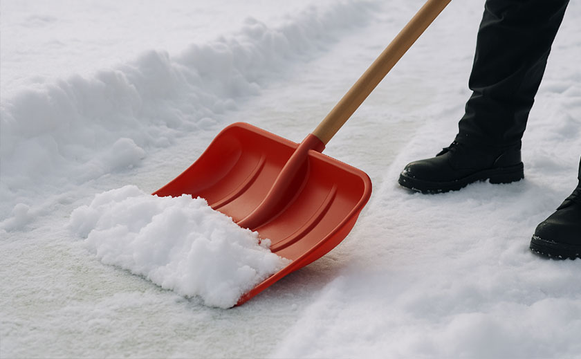 雪かきは、プラスチック製やラバー製のスコップを使いましょう。 金属製のスコップは刃先が硬いため、芝糸や基盤シートに傷をつけるリスクが高く、人工芝の寿命を縮めてしまう原因になります。 また、雪かきは力を入れて一気にかき取るのではなく、表面をなでるように少しずつ雪を移動させていきます。 日差しがあって温かい時間帯であれば、最後に水をかけることで雪が溶け出して流れていきます。固まった氷は無理に剥がさない