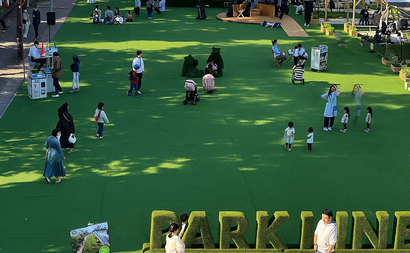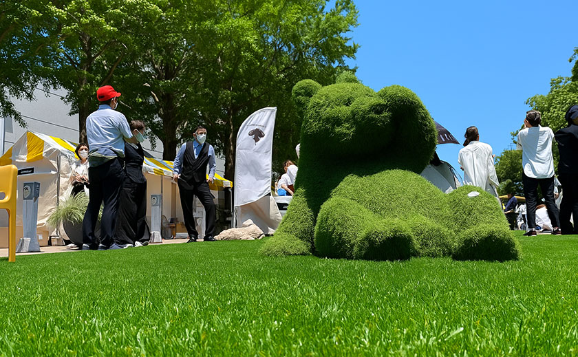 出入り口には「PARKLINE」の芝生モニュメントを設置し、くまや椅子の形をした造形樹(トピアリー)も配置するなど、写真映えする心地よいイベントスペースを演出しました。